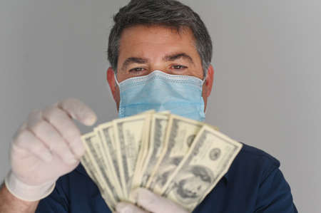 Doctor's hand in medical gloves with dollar bills, paying cash
