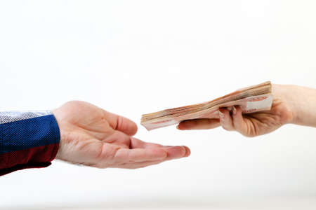Bribery. A woman's hand gives a bribe a man's hand in a shirt the color of the Russian flag. Side view. White background. Concept of world anti-corruption day, December 9.