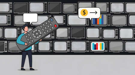 Man with remote control and speech bubbles before a wall of televisions Clear details and vibrant...