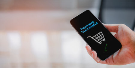 Man hand with mobile phone and transaction application, payment successful screen. Concept of e-commerce and online banking. Cellphone for banking on mobile app or order service