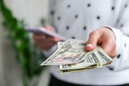 Business Woman Displaying a Spread of Cash US dollars. Close-up. Income and Business concept. Venality, bribe, corruption concept. Hand giving money. Millennial candid authentic female hands counting money usd. Business budget of wealth and prosperity finance