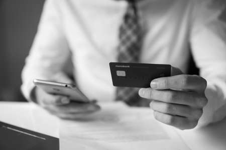 Male hands holding credit card and using smartphone at working desk for online shopping while break from work at home, E-commerce, Internet banking.