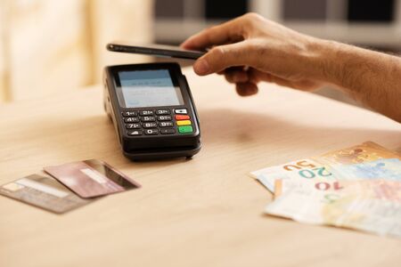 Customer using credit card for payment at cafe or shop by terminal with nfc cashless technology