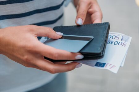 Selective focus of hand with cash and credit card payment exchanging credit card and money.