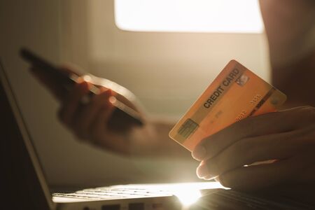 Online shopping concept in morning light. Closeup of young man making man hands using smartphone and holding credit card with social Payment online shopping smartphone at working place.