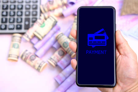 Online transfer money techonology. Money received inscription, business by using mobile phone and online banking application photo