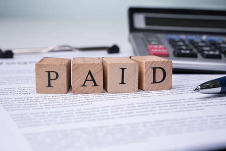 Close-up Of Paid Text On Wooden Blocks Over Office Documents With Calculator