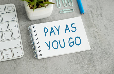Pay as You Go text on open notebook with keyboard buttons and office supplies on grey table