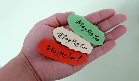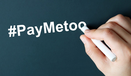 #PayMeToo as a new social movement. A finger holding piece of paper with #PayMeToo written.