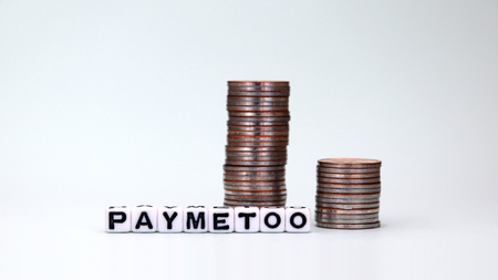 #PayMeToo as a new campaign to close the wage gap between men and women. Torn paper as #PayMeToo and coins.