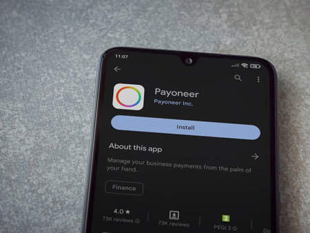 Lod, Israel - July 16,2023: Payoneer app play store page on smartphone on ceramic stone background. Top view flat lay with copy space.