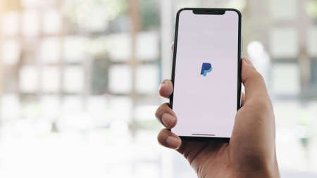 CHIANG MAI, THAILAND - JUL 24, 2020 : Woman hands holding iphone Xs with PayPal apps on the screen. PayPal is an online electronic payment system.