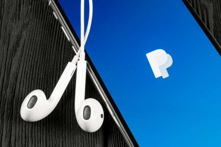 Alushta, Russia - August 26, 2018: iPhone X with service PayPal on the screen and background wooden desk. iPhone 10 was created and developed by the Apple inc.