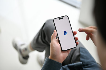 Chiang Mai, Thailand - Feb 17 2023: close-up image of an Asian man using PayPal mobile application to pay his bills. iPhone with PayPal logo on screen. overseas banking, money transaction service