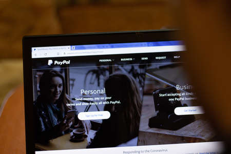 New York, USA - 9 April 2020: PayPal website on laptop screen close up. Man using service on display, blurry background, Illustrative Editorial.
