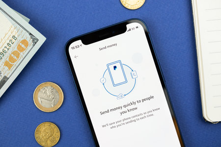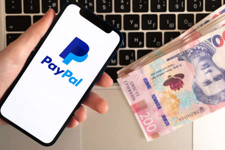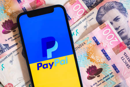 Kharkov, Ukraine - March 18, 2022: Paypal and Ukraine money on background. Mobile phone with modern online banking system, financial concept