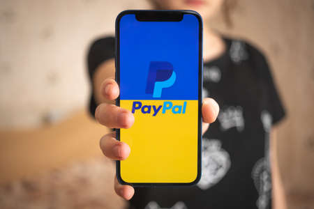 Kharkov, Ukraine - March 18, 2022: Paypal in Ukraine background. Mobile phone with modern online banking system. Woman holding smartphone with logo and flag background close-up