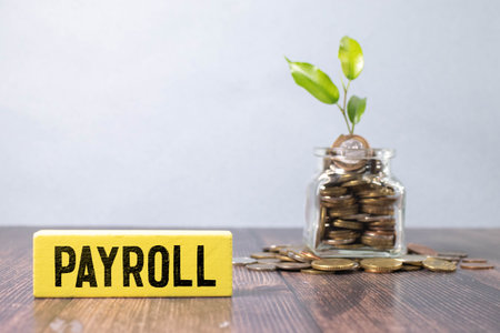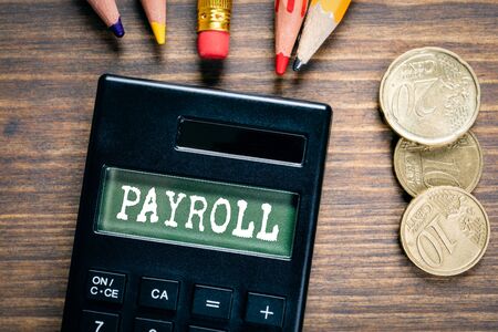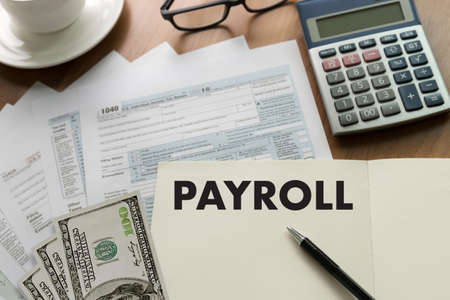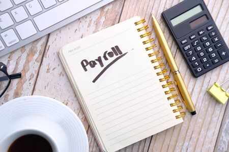 Payroll word writing on notepad with office stationary.