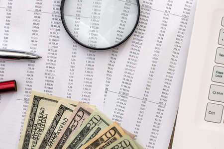 Business and financial background with dollars, data, pen and calculator. Bookkeeping background.