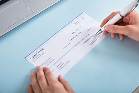 Businesswoman Signing The Company Cheque On Blue Desk