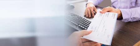 A Businessperson's hand giving cheque to customer and dollar bill, coin, laptop and graph chart on the desk at office. Payment by check, paycheck, payroll concept.