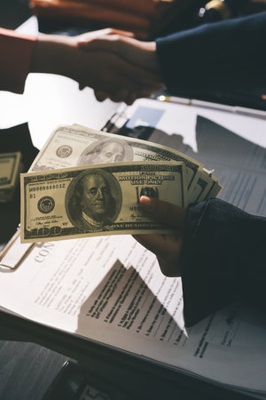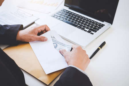 Bribery and corruption concept, bribe in the form of dollar bills, Businessman giving money in the envelope while making deal to agreement a real estate contract and financial corporate.