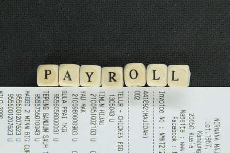 receipt with the word Payroll on a small wooden cube