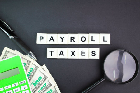 pen, calculator, paper money and a magnifying glass with the word Payroll taxes. income tax concept. individual income tax payment