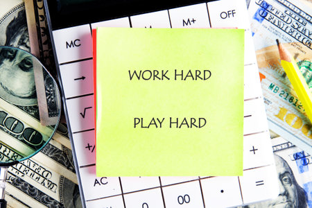 A yellow sticky note that reads work hard play hard sits on top of a white calculator surrounded by American money and a pencil. A magnifying glass rests on the cash.