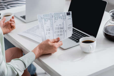Cropped view of woman holding bills near cup of coffee and laptop at home