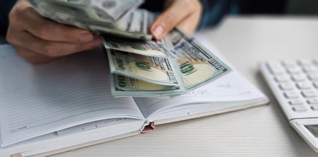 Cash dollar bills in female hands near computer keyboard