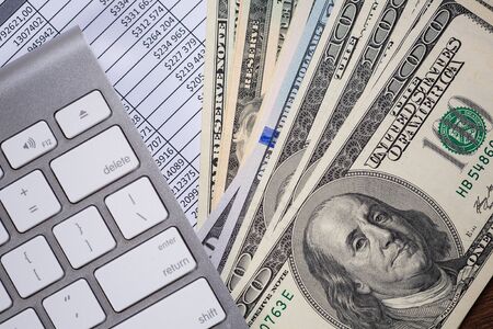 Money cash banknotes calculations and computer keyboard on table