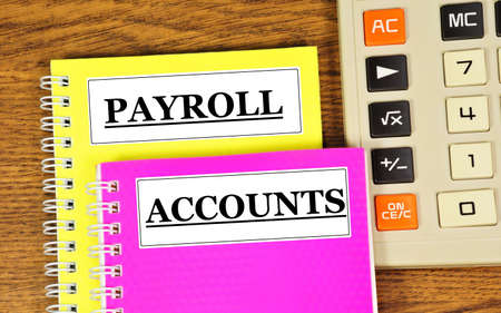 Payroll and accounts. Text labels on the folders of accounting documents and a calculator for financial calculations.