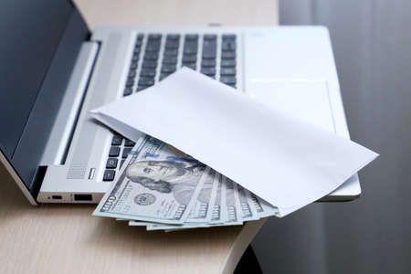 Envelope with US dollars on laptop keyboard. Wages, bonus or bribe concept