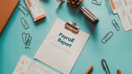 This image features a payroll report on a desk with various office supplies like clips and pens, emphasizing organization in the workplace for effective business management.