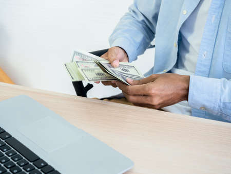 Close-up dollars money banknotes in businessman's hand. Blurred movement of counting money near laptop computer on table, profit from online business concept on white wall background.