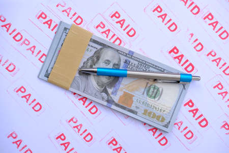 Counting US paper currency one hundred dollar in against us dollar background