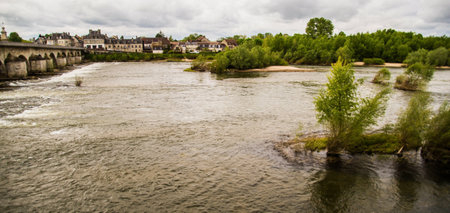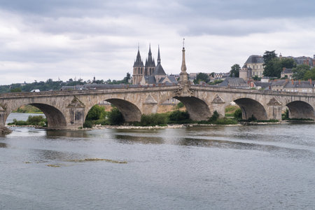 Pont Wilson Bridge and Blois Skyline - Wide view of the Loire River with the historic Pont Wilson stone bridge and the city skyline of Blois, France, under a cloudy sky.
