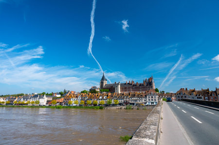 Views of houses, bridge and castle in old part of town of Gien is on the Loire river, in Loiret department, France