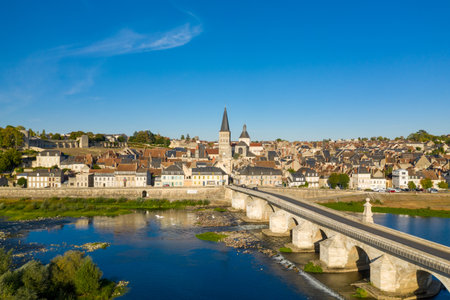 Wide aerial perspective reveals the historic stone bridge spanning the Loire river, with clustered medieval rooftops and lush green riverbanks in La Charite sur Loire. Bright sunlight and clear blue sky highlight the tranquil Loire Valley landscape and the towns riverside charm.
