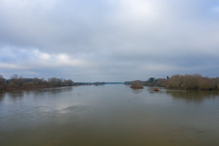 Expansive view of the Loire river bordered by leafless trees and brush, with muted reflections beneath a blanket of pale winter clouds. The tranquil water and subdued colors evoke a serene, contemplative mood.