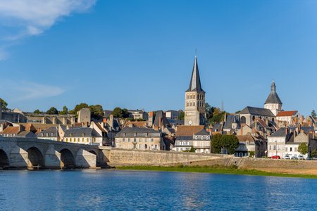 Distinctive church spire rises above the old town skyline of La Charite sur Loire, with stone bridge arches and traditional houses lining the Loire riverbank. Bright blue sky and clear daylight highlight the medieval architecture and riverside setting.
