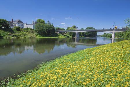 Creeping water primrose yellow flowers blooming on a bright day along the river La Vienne L'le-Bouchard, France.
