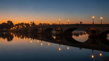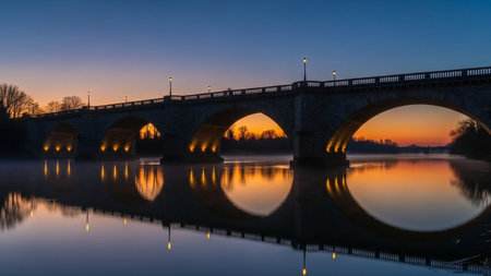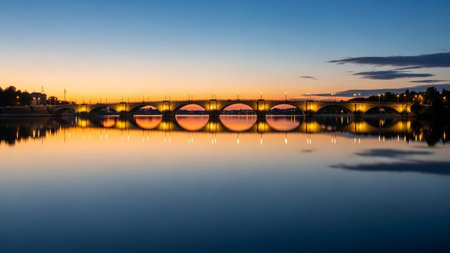An elegant, modern bridge arching over a calm river, illuminated by soft lighting in the evening