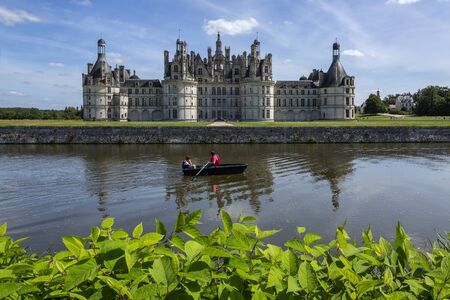 Chateau de Chambord with the River Cosson in the foreground in the Loire Valley in France. The 440 room chateau dates from 1519 and is the largest in the Loire.