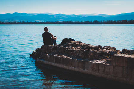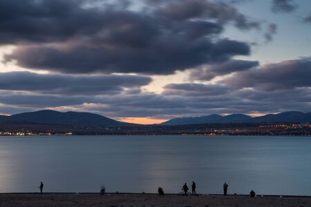 Fishermen on the shore of Gelendzhik Bay stand in a row and catch a Sargan. Blue evening. Long exposure. Clouds. Mountains in the background. Philosophical and sad mood