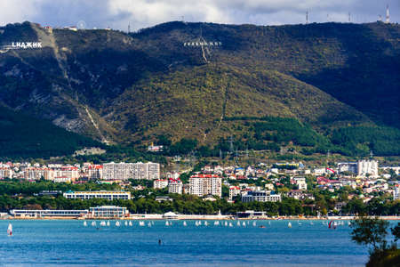 Sea resort town of Gelendzhik at sunset. Late autumn on Black sea coast