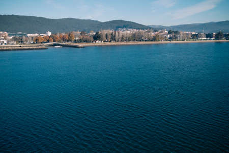 Aerial view of the landscape overlooking the Russian bridge. Vladivostok, Russia