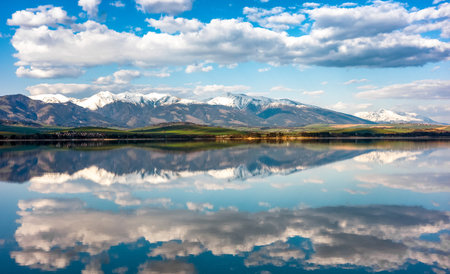 Reflection of snowy peaks from Western and High Tatras in calm lake Liptovska Mara in SLovakia