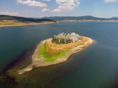 Aerial panoramic view of Island on a Batak Reservoir located in Bulgaria, Rhodopa Mountains